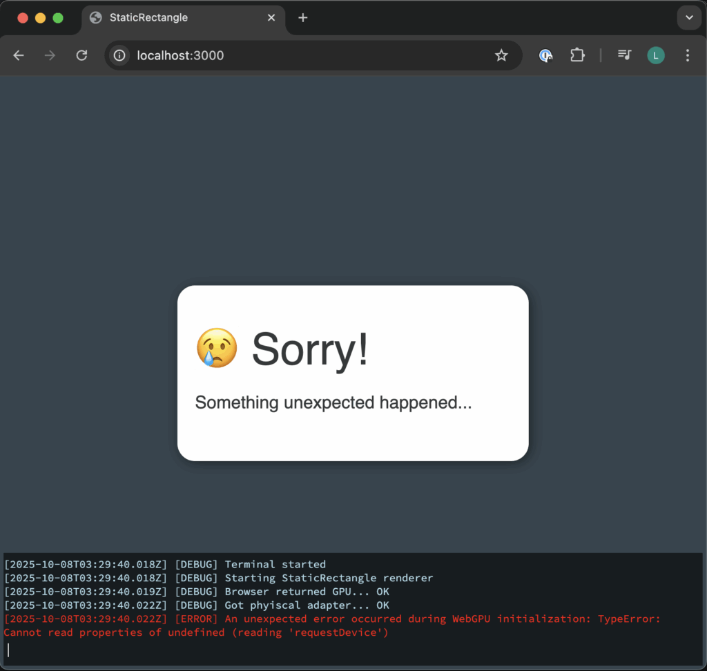 I have been testing on Safari (that has WebGPU disabled by default, at least in the version I have) and Chrome. I expect Safari to land on the “Sorry” page, which is something that happens when something bad happens, expected (no WebGPU support) or otherwise (something broke).