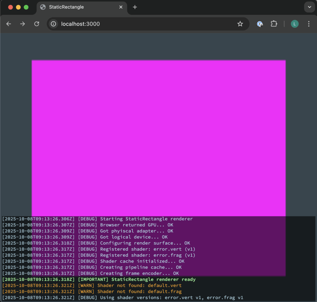 While I admit, this is far from exciting. It’s not even a very nice colour (1.0 had a nice green static rectangle as the first shape drawn). In this case, the colour choice is intentional, it’s the ‘error’ shader that is used when the requested shader isn’t available (and you can see that in the terminal I opened). However, just like last time things can move a lot faster now, the majority of the initial time is in design and setup, and once you can render one rectangle (technically two triangles), you can render many, in any configuration you want.